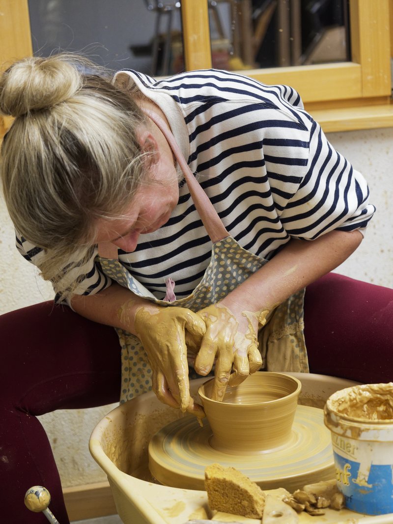 Seit über 5.000 Jahren werden Gefäße auf der Töpferscheibe gedreht. Unter qualifizierter Anleitung erlernen Sie die verschiedenen Arbeitsgänge (Tonaufbereitung, Zentrieren, Aufbrechen, Bodensetzen, Grifftechniken) auf der elektrischen Töpferscheibe. Anfänger:innen lernen die ersten Handgriffe zum Drehen von kleinen Gefäßen kennen. Fortgeschrittene vertiefen ihre Fähigkeiten und versuchen sich an größeren Gefäßen.