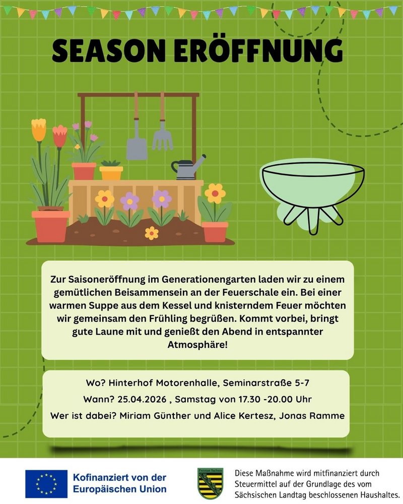 Wir starten gemeinsam in die neue Gartensaison – und ihr seid herzlich eingeladen! Kommt vorbei zu einem gemütlichen Abend an der Feuerschale, mit warmer Suppe aus dem Kessel und einer entspannten Atmosphäre. Lasst uns zusammen den Frühling begrüßen, ins Gespräch kommen und einfach eine gute Zeit miteinander verbringen